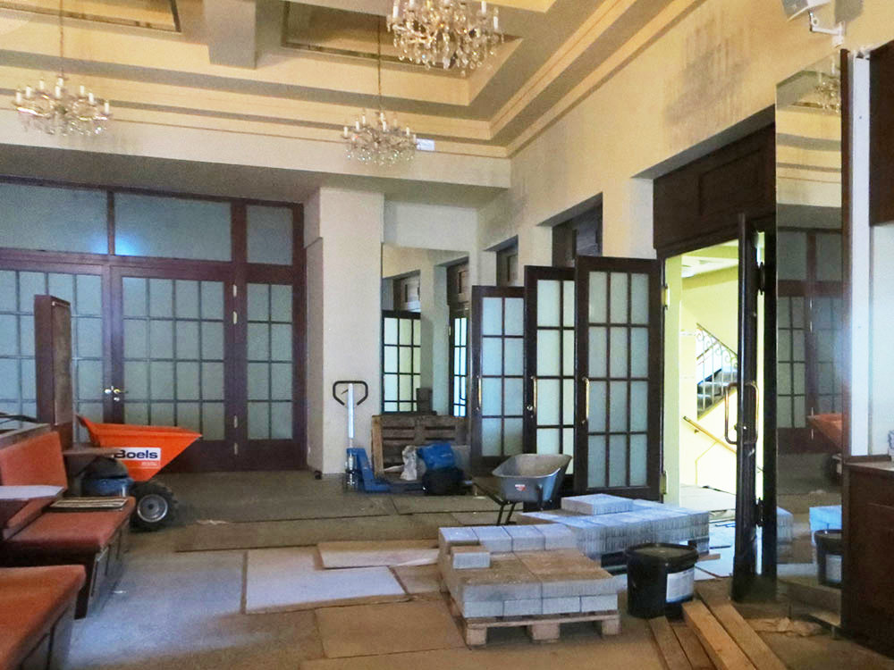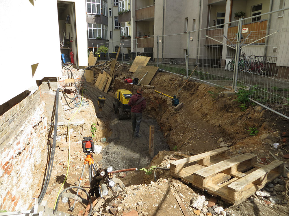 Eine sehr ungewöhnliche Herausforderung im Zusammenhang mit den Landschaftsbauarbeiten war die Baustellenzufahrt vom Haupteingang durch das Foyer der musikalischen Komödie in den kleinen Innenhof: Sämtliche An- und Abtransporte für die Umsetzung, wie Kies, Sand, Betonwerksteine, Gehölze und eine Pergola nahmen diesen Weg. „Akrobatische“ Leistungen wurden den Mitarbeitern der Baufirma abverlangt, ging es doch treppauf und treppab über schiefe Ebenen. Im Innenhof mit einer Fläche von 100 Quadratmetern musste logistisch sehr akribisch gearbeitet werden.
