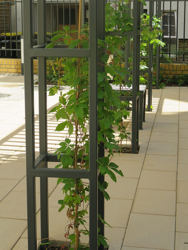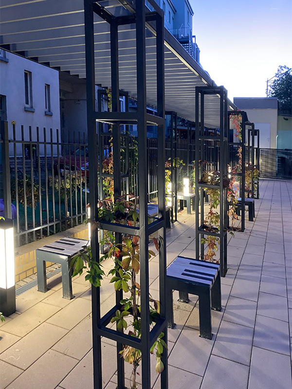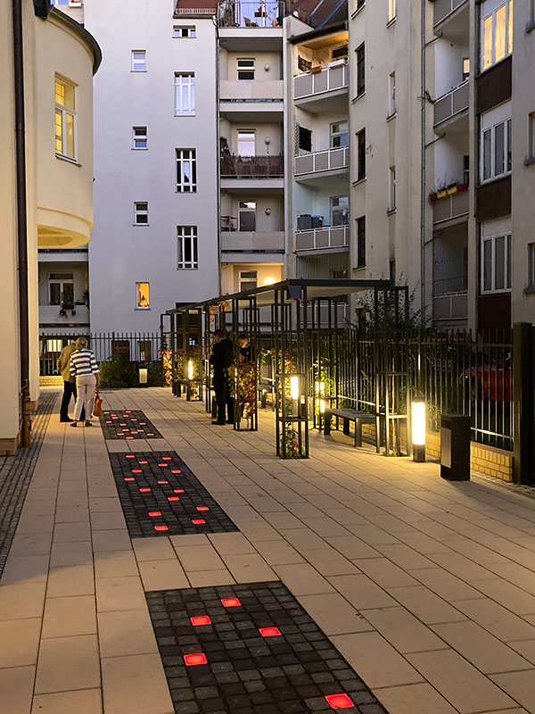 Inszeniert wird der große Hofraum mittels drei anthrazitfarbener Steinteppiche am unmittelbaren Ausgang. Diese werden illuminiert mit LED-Bodeneinbauleuchten in der Farbe Rot – in Entsprechung zur „hauseigenen“ Farbe an der Musikalischen Komödie. Gefasst wird der Raum durch eine filigrane Pergola, bewachsen mit schattenspendenden Kletterpflanzen.