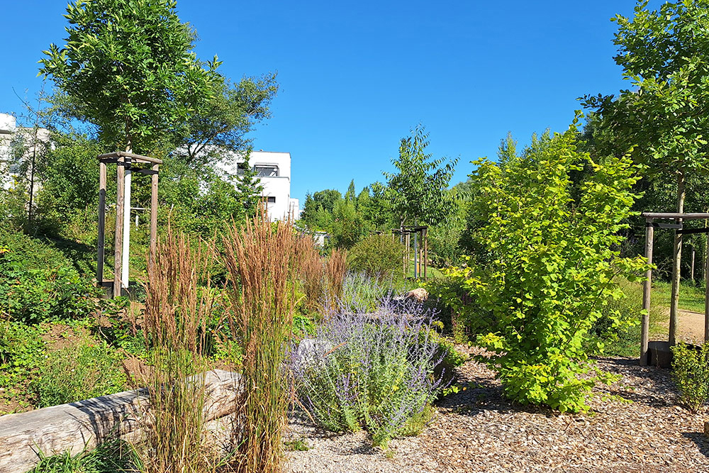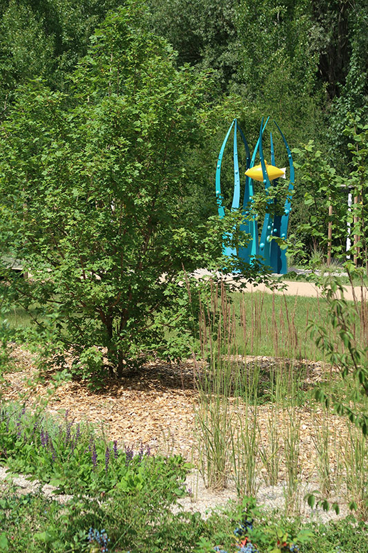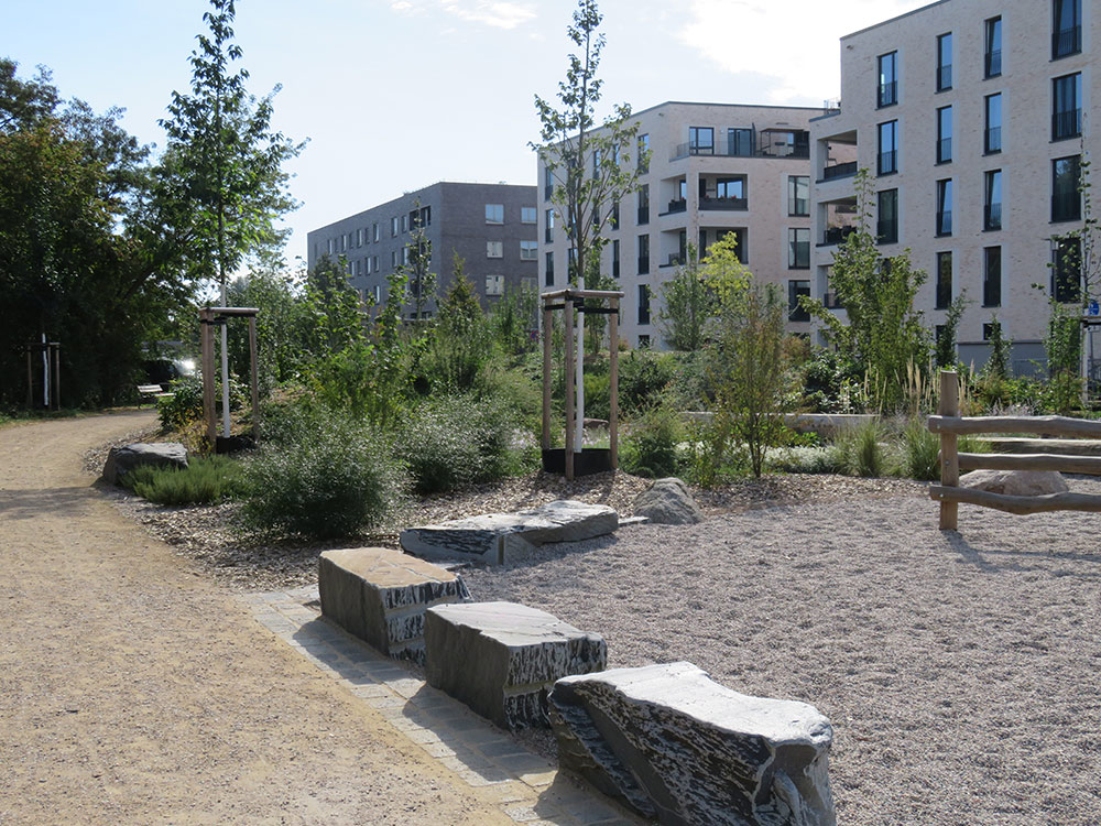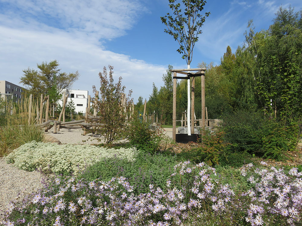 Durch das Sinnbild von Unüberschaubarkeit, Naturnähe und Vielfalt entstehen sich verändernde Situationen mit hoher optischer Qualität und zugleich vielfältigen Spielwert. Organisch in den neu geschaffenen Freiraum betten sich zum Motiv passende Spiel- und Sitzangebote.