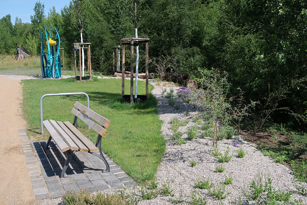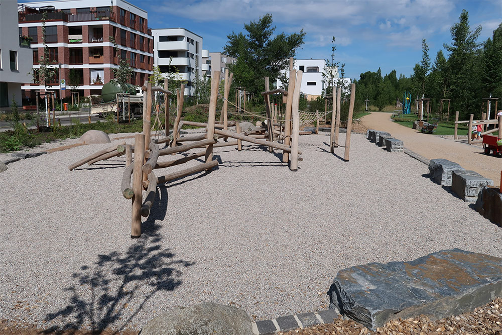 Im direkten Umfeld des Lindenauer Hafens in Leipzig bindet der neue naturnahe Spielplatz an den Grünzug zwischen dem Gebiet der Schönauer Lachen und der Grünverbindung entlang des Karl-Heine-Kanals an.
