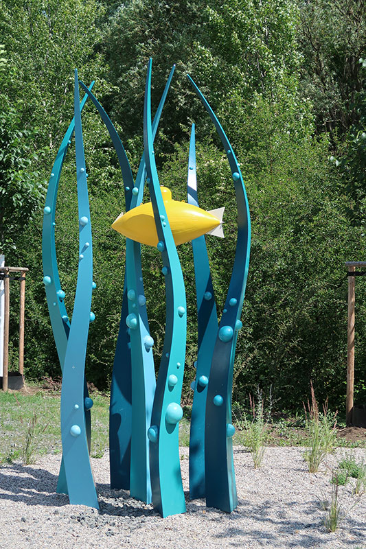 Als besonderes Identifikationselement dient die Plastik des Künstlers Jan Viecenz aus Halle zum Thema ‚Wasser/Mensch/Hafen‘, welche ganzjährig im Eingangsbereich einen farbigen Blickpunkt bildet.